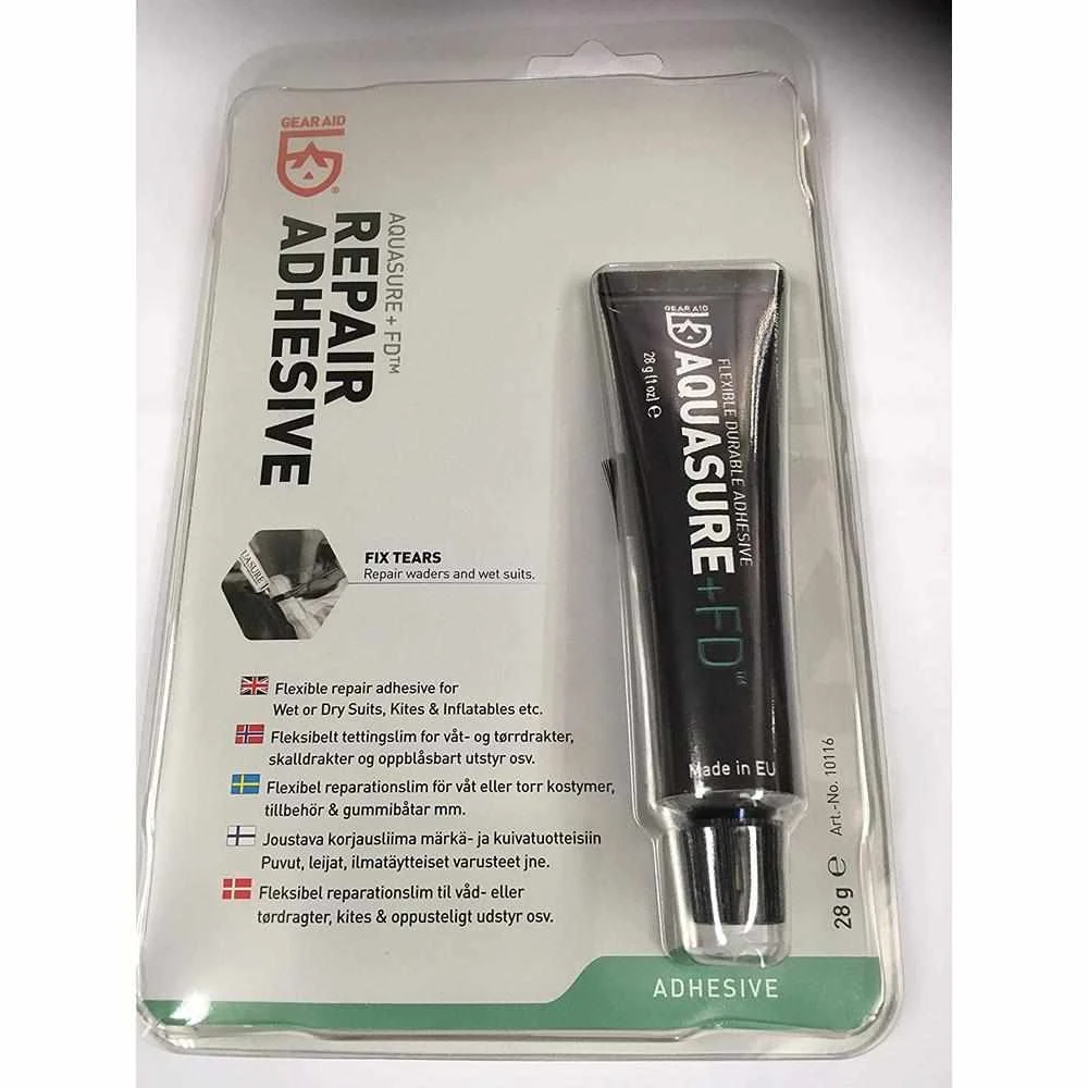 Aquasure is the original and best urethane rubber adhesive. It provides a clear, strong and flexible finish suitable for permanent waterproof repairs to holes, tears or leaking seams in most types of fishing and water sports equipment. Aquasure may be applied to high wear areas such as neoprene knee and elbow sections to help protect against abrasion. Aquasure cures overnight.