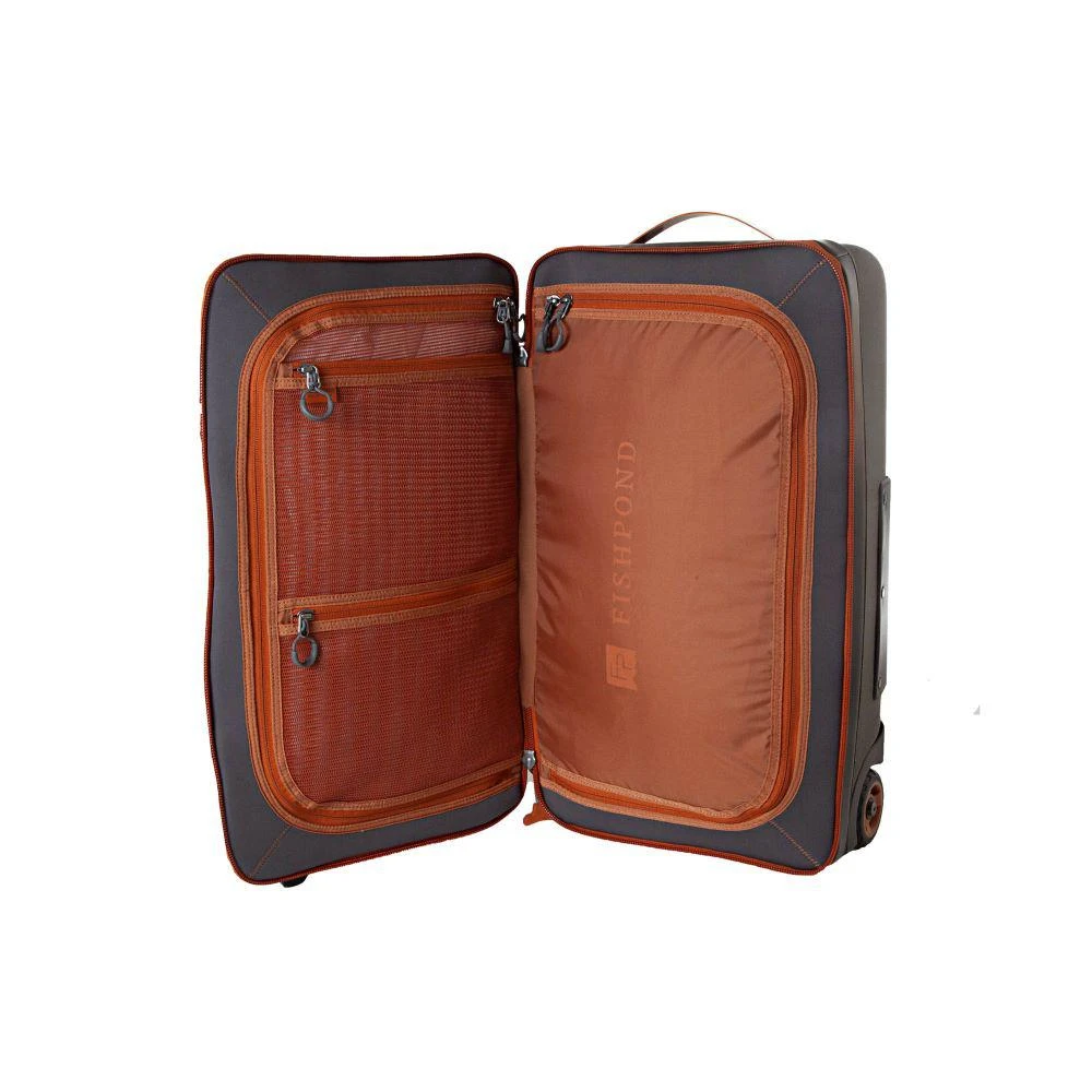 Discover the Stormshadow Rolling Carry-On—a versatile travel companion created for both wilderness adventures and urban getaways. Effortlessly navigate airports with essentials like your passport, clothes, and outdoor gear. Exterior pockets aid in organisation on the go, and convenient external tie-down points make carrying fly rods a breeze. Crafted from durable TPU-coated recycled fabric, this highly weather-resistant carry-on ensures your gear will arrive in the shape you packed it in. Ideal for overhead compartments, it combines practicality with eco-friendly design for a seamless travel experience.