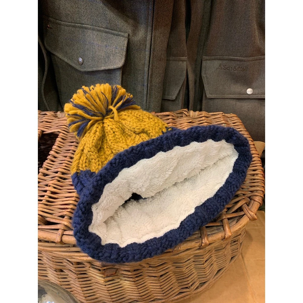 Heavyweight multi-yarn cable knit design. Bold two-colour design. Luxury pom pom. Luxurious Shearling thermal band for extra warmth.