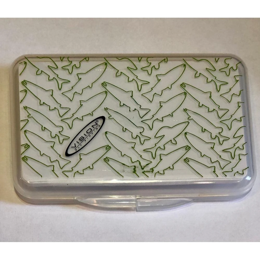 A vision hard fly box with slit foam insert holds 6 Caledonian fly company premium quality trout flies.Â