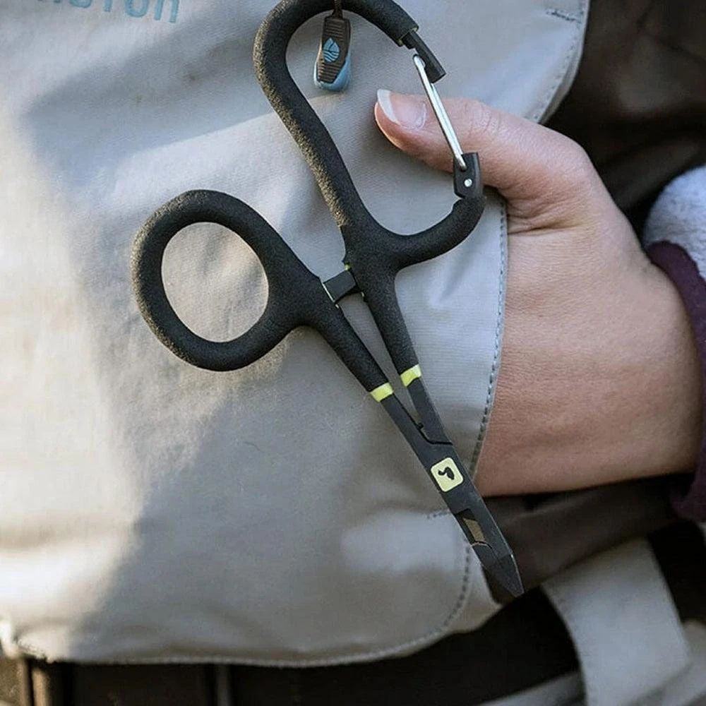 The ultimate hemostat, thoughtfully designed from the tips to the jaws to the handle. The tight angles and engineered shape accommodate all fly sizes, allow for easy hook removal, and can crimp even the heaviest of barbs. Oversized thumb and finger holes accomodate large or gloved hands, and the compact cutting surface easily clips light or heavy leader.