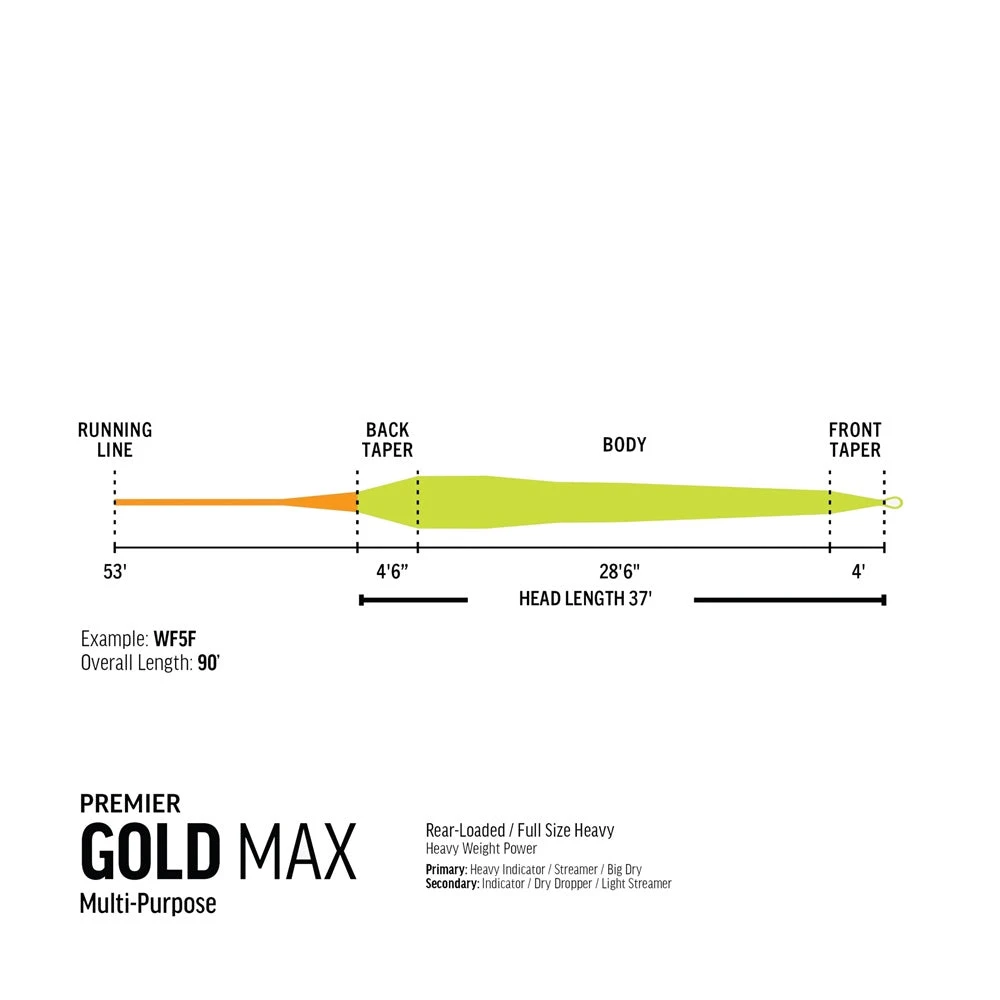 At a full line-size heavy, GOLD MAX is RIO’s most powerful all-around taper for delivering plus-size rigs that get bites in fisheries not centered around long leaders and tiny drys. With the shortest head length in the GOLD class, MAX is the right fit for smoothly loading weightier, unwieldy payloads. The short head carries more weight toward the back of the body so anglers can turn over heavier rigs more efficiently, while the shorter front taper combined with tapered body roll-casts bulkier rigs with ease, mends effortlessly at distance and delivers large drys with finesse. For powerful versatility, GOLD MAX lets you cast more weight under control, while also allowing for presentations decidedly cleaner than overly front-loaded line configurations.