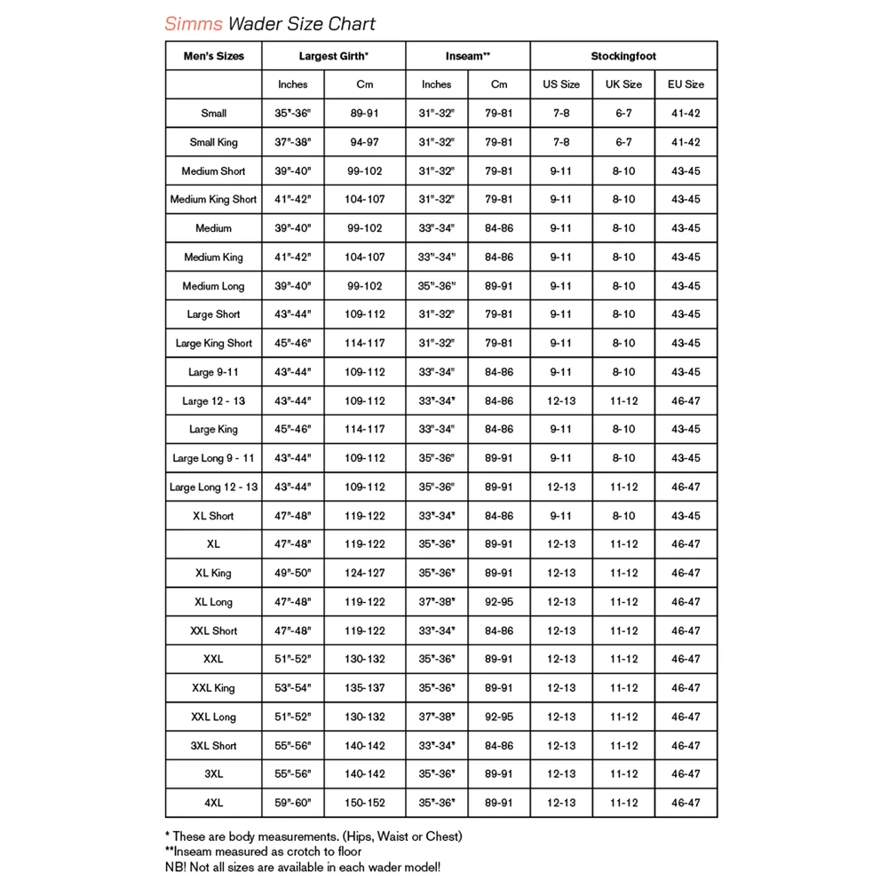 | WADER SIZE | LARGEST GIRTH (Chest, waist or hip) | INSEAM (Crotch to floor) | STOCKINGFOOT | ||||