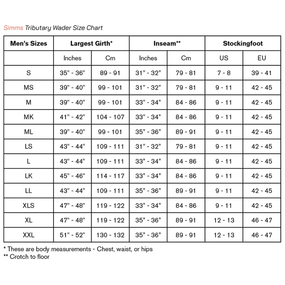 | WADER SIZE | LARGEST GIRTH (Chest, waist or hip) | INSEAM (Crotch to floor) | STOCKINGFOOT | ||||
